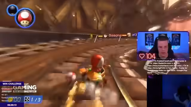 08:38:41Der Streamer spielt ein intensives Mario Kart Rennen mit mehreren Teilnehmern. Das Gameplay wird von strategischen Elementen und actionreichen Szenen geprägt. Die Spieler kommunizieren kontinuierlich über Positionen, sammeln Münzen und nutzen Items wie Bananen, Feuerpflanzen und Bomben, um sich gegenseitig zu attackieren. Es kommt zu mehreren knappentschiedenen Situationen, Versuchen, Plätze zu verteidigen oder im letzten Moment aufzuholen. Die Stimmung ist trotz des Wettbewerbs durchgehend unterhaltsam und von häufigen spielerischen Pannen geprägt.