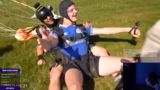 09:26:58Der Streamer unternimmt einen Segelflug als erstes Erlebnis, um sich an das Fliegen zu gewöhnen. Anschließend startet der eigentliche Tandemsprung aus 4000 Metern Höhe. Während des Fluges und vor dem Sprung wirken beide Beteiligten gespannt, aber der Streamer genießt die Aussicht. Der Sprung selbst wird als "wahnsinnserfahrung" beschrieben. Die Landung erfolgreich gemeistert, woraufhin der Streamer begeistert seine Zugehörigkeit zur "kleinen Kreis der Fallschirmspringer" proklamiert und seine Bereitschaft für zukünftige Spründe äußert.