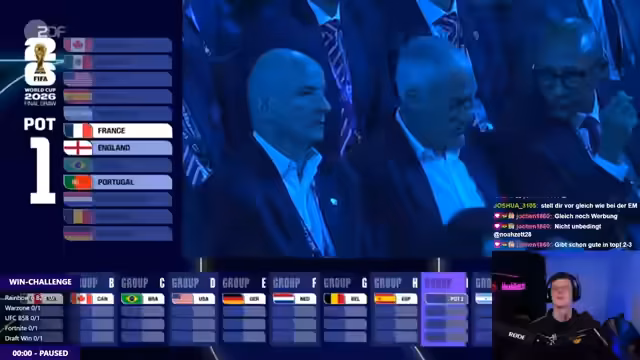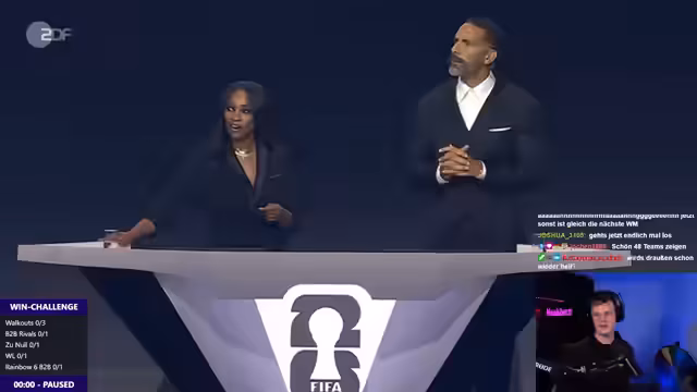 00:08:22Nachdem der Streamer zunächst von der laufenden WM-Auslosung nichts wusste, zeigt er sich beeindruckt von der inszenierten Show des FIFA-Präsidenten Gianni Infantino. Er kommentiert die spektakuläre Präsentation, die internationale Stars und eine beeindruckende Live-Stimmung im Kennedy Center beinhaltet und als eine Art Show-Event im Stil des Super Bowls beschreibt.
