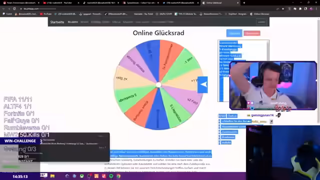 15:28:20Um die anstrengende Weekend League zu unterbrechen, simuliert der Streamer ein Glücksrad von Kabel 1, das als 'erfolgreichste Gameshow der Welt' bezeichnet wird. Er dreht das Rad, um zufällige und oft belastende Aufgaben für seine Spiele zu generieren, wie z.B. einen Spieler zu wechseln oder ein Eigentor schießen zu müssen. Das dient als humoristische Ablenkung von den ernsten FIFA-Spielen.