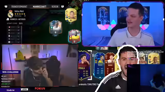17:43:04Ein Wettbewerb zwischen Streamern startet, bei dem es um 300 Euro geht. Sie ziehen teure Lightning-Round-Packs, die jeweils 1000 FIFA Points kosten. Die Spannung ist hoch, da um hohe Summen gespielt wird. Es kommt zu Spannungen über die Fairness des Ziehens, wobei ein Teilnehmer heimlich weiterzieht. Ein 91er Breune bringt einen der Spieler in Führung, was den Wettbewerb noch intensiver macht.