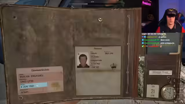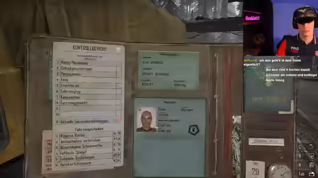 05:17:25Gegen 18 Uhr wechselt der Streamer zum angekündigten Spiel "Contraband Police Simulator". Er schlüpft in die Rolle eines Polizisten an einer Grenzkontrolle und erklärt die grundlegenden Aufgaben: die Kontrolle von Dokumenten wie Reisepässen, die Prüfung auf Übereinstimmungen von Namen und Fotos und die Entscheidung über die Einreise von Fahrern. Das Ziel ist es, Schmuggler aufzudecken und die Sicherheit der Grenze zu gewährleisten.
