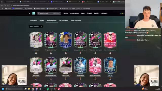 00:12:02Die Diskussionen drehen sich um neue Karten im FIFA 25 Ultimate Team. Analysten zeigen neue SBCs und Player Cards, die im Shop erschienen sind. Der Streamer prüft potenzielle Verstärkungen für sein Team, insbesondere für die Sturmposition. Dabei werden verschiedene Spieler wie Gareth Bale, Johann Cruyff und M'bappé auf ihre Eignung und Stats hin analysiert. Es werden auch neue SBCs wie der Modric oder diverse Team of the Week Upgrades als Optionen für den Coin-Verbrauch ins Auge gefasst.