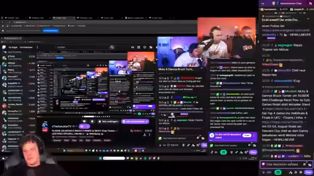 04:53:13Gegen 18:00 Uhr wird der Start des großen 'Bruch-Cup' angekündigt, ein Turnier im Rahmen der Markteinführung der neuen Mode-Marke 'Certified Identity'. Die Organisatoren haben das Turnier sorgfältig geplant, und die Teams sind final. Alle 18 Teams, inklusive derer von noahzett28 und @seyyn, werden vorgestellt und bewertet. Favoriten wie Matze & Breitenberg, Pentagon & Noisy und Respatz & Schradin genannt. noahzett28 ist überzeugt von den Chancen seines eigenen Teams, insbesondere von Noah Zett in der Disziplin UFC, den er als den besten Spieler des Turniers sieht.