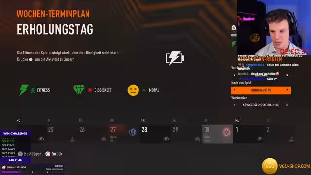06:03:53Nachdem er seine Frustration abgebaut hat, fährt der Streamer mit der Win-Challenge fort und übernimmt PSG in FIFA 17. Trotz eines schnellen Starts und des Gewinns des französischen Doubles, macht ihn das Zufallssystem (Münzwurf) für den Champions-League-Titelfavoriten Real Madrid verantwortlich. Dies führt zu einer emotionalen Reaktion und der Verlängerung der Challenge.