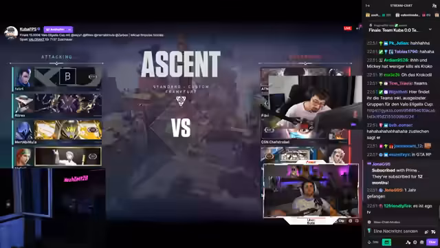 04:54:43Der Stream beginnt mit Ankündigungen und Einstimmung auf das Finale des Valo Eligella-Cups mit 15.000 Euro Preisgeld. Der Streamer gibt bekannt, dass er bis 6 Uhr bleiben wird. Es werden Teams vorgestellt und Leistungsbewertungen gegeben. Das Spiel beginnt mit der Map Selection, bei der die Teams Ascent wählen. Es finden Diskussionen über Attack- oder Defense-Start statt, und der Streamer erklärt seine Strategie für das Best-of-Finale.