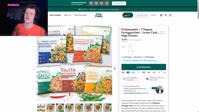 00:04:49Der Stream beginnt mit einem herzlichen Hallo an die Zuschauer. Der Streamer erwähnt das gestrige Valorant-Turnier mit Miki, das nicht optimal verlief, aber bedankt sich für die Anwesenheit. Es folgt eine Ankündigung für eine gemeinsame Watch-Party zum Edi Geller Cup. Ein neuer Partner wird vorgestellt: LifeFresh, der gesunde Fertiggerichte liefert. Der Streamer preist deren Produkte, darunter vegane Options, High-Protein-Mahlzeiten und verschiedene Currys, die er selbst getestet und für exzellent hält. Für zwölf Gerichte zahlt man 55 Euro, was als fairer Preis betrachtet wird. Zuschauer werden ermutigt, sich die Produkte anzusehen, auch ohne etwas zu kaufen, da dies den Streamer unterstützt.