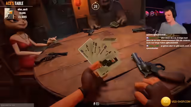 06:32:16Die erste Runde von Elias Bar wird gestartet, um den Spielern die Mechaniken zu verdeutlichen. Der Fokus liegt auf dem Bluffen und dem Versuchen, die Karten der Gegner richtig einzuschätzen. Spieler müssen abwägen, ob ein Gegner lügt, wenn dieser bestimmte Karten wie Könige oder Damen aufdeckt. Die Runde ist schnell und actiongeladen, wobei die Spieler versuchen, durch geschicktes Spielen und geschicktes Lügen im Spiel zu bleiben und die anderen Spieler auszutricksen.