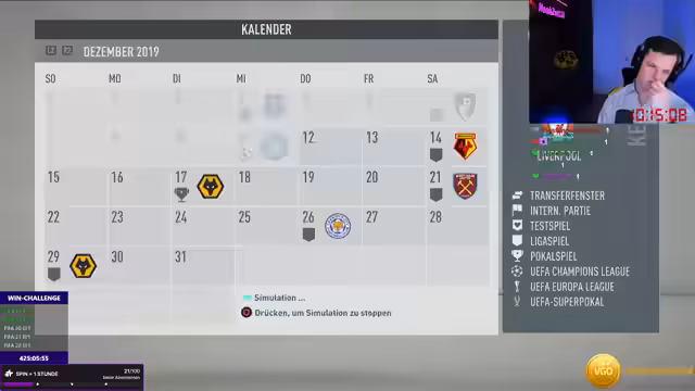 06:15:05Es steht das letzte, entscheidende Spiel um die Meisterschaft an. Ein Sieg bedeutet der mögliche Knackung des Karriere-Win-Challenge Rekords, eine Niederlage bedeutet ein schlimmes Ende. Trotz der Stärke des Kaders fühlt sich der Streamer von der Simulation um jeden Erfolg gebracht. Mit knapper Verpflichtung von Ronaldo als linker Flügler wird eine letzte Verzweiflungstat unternommen, um das Spiel und damit den möglichen Rekord zu sichern.