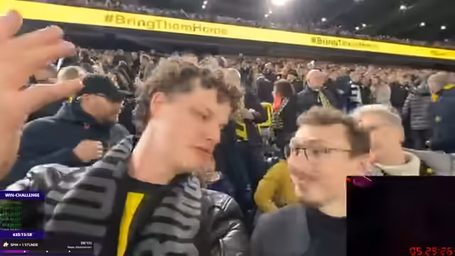 12:12:00Der Streamer berichtet live vom Bundesligaspiel des BVB gegen Eintracht Frankfurt im Stadion. Er begleitet das Spiel von der Tribüne aus, zeigt das Stadionambiente und kommentiert die Spielzüge. Das Spiel endet 3:1 für den BVB, und der Streamer zeichnet mehrere torprägende Momente auf, um sie später in einem Video zu verarbeiten.