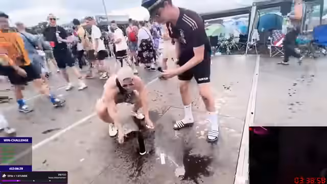 10:44:40Die Übertragung wechselt zu Festivaleindrücken vom Parukabel-Festival. Der Streamer und sein Companion führen verschiedene, oft vulgäre und Alkohol betreffende Challenges durch. Dazu gehören das Trinken von Bier, das Ziehen von 'Bierbogen' und das Bestehen von 'Trombola'. Der humorvolle und leicht chaotische Ton der Szene steht im starken Kontrast zum vorherigen sportlichen Wettbewerb.