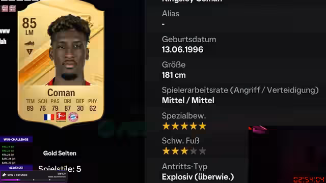 21:49:40Der Streamer startet ein Pack-Experiment mit 12.000 FIFA-Points (Wert 100 Euro), um zu testen, was bei der Investition in den bevorstehenden FIFA 24 zu erwarten ist. Nach anfänglich schlechten Ergebnissen wie einem verletzten Spieler und einem kaum bekannten rumänischen Mittelfeldspieler, gelingt ihm der entscheidende Durchbruch. Er zieht einen hochtalentierten Flügelspieler namens King Slay, dessen Werte für Tempo und Skills begeistern und den er als den "ersten Big Player" in seinem Team feiert.