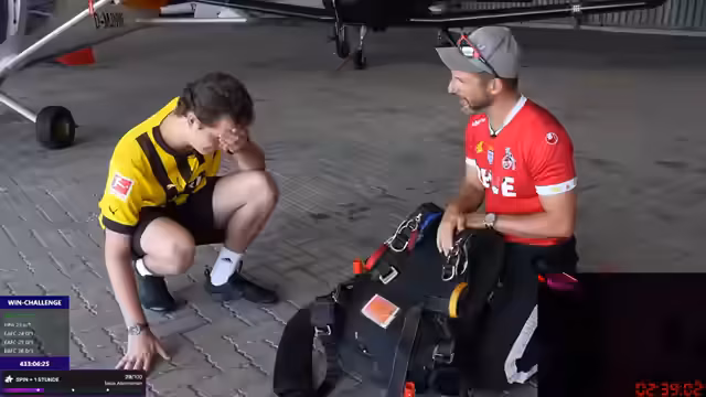 15:19:46Nach dem Anziehen des Springeranzugs beginnt der Gang zum Flugzeug. Die Aufregung des Streamers ist spürbar, er ist massiv nervös und weiß nicht, was auf ihn zukommt. Der Flug zum Sprungplatz erfolgt mit einem Segelflugzeug. Die Beschleunigung wird mit einem Sportwagen verglichen. Nach dem Start in 4000 Metern Höhe folgt der Freifall, den der Streamer als überwältigend und surreal beschreibt, da man dem Erdball nur langsam näherkommt. Die Landung erfolgt sicher und erfolgreich.