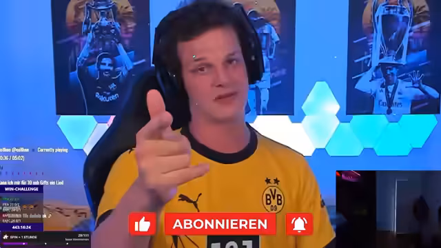 09:11:16Nach einem Duo-Sieg in Call of Duty wechselt der Streamer zurück zu FIFA. Er startet in die Weekend League mit einem Borussia Dortmund-Team und ambitioniert 20 Siege. Das Team besteht aus Starspielern wie Moukoko und Füllkrug. Trotz eines frühen Rückstands wird ein Sieg und ein 3:1 gegen Bayern gefordert. Die Stimmung ist enthusiastisch und die Anspannung in den Siegesspielen ist spürbar.