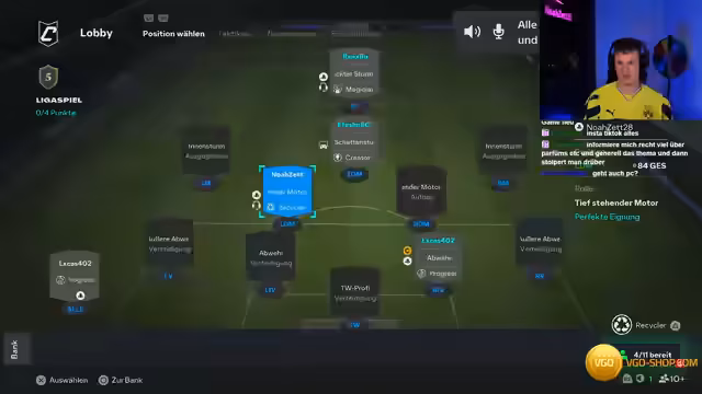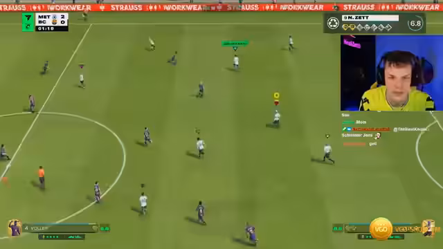00:11:29Nach dem Pro-Clubs-Spiel werden die zukünftigen Stream-Aktivitäten vorgestellt. Für Sonntag ist ein Simulator-Abend mit Uwe geplant, der später wegen eines Stadionbesuchs gegen Hoffenheim auf 22 Uhr verlegt wird. Der Streamer stellt sein Pro-Clubs-Team 'Volles Met 28' vor, einen 84er ZDM mit hohen Attributen wie 90 Stärke, 80 Abfangen und 90 Bewusstsein. Es wird auf die Notwendigkeit hingewiesen, dass sich weitere Community-Mitglieder dem Verein anschließen sollen.