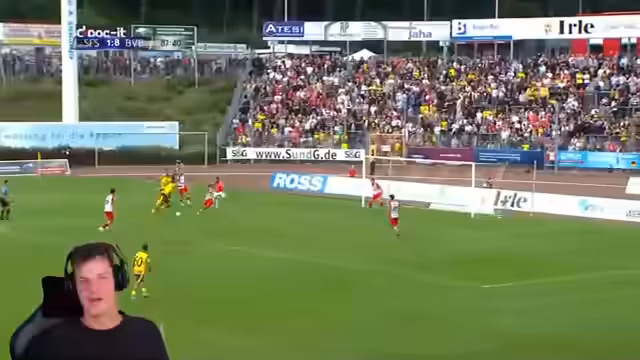 01:04:41Nach dem UFC-Training kehrt der Stream zurück zum Fußballspiel zwischen Sportfreunde Siegen und Borussia Dortmund. Die zweite Halbzeit verläuft etwas ruhiger als die erste, und beide Teams wechseln einige Spieler. Sportfreunde Siegen zeigt eine kompakte Defensivformation mit ihrem taktischen 'Siegen-Zone-Prinzip', das minimalen Abstand zwischen den Spielerreihen hält. Borussia Dortmund erzielt noch ein weiteres Tor durch Sebastian Haller, und das Spiel endet mit einem deutlichen 7:1 für den BVB.