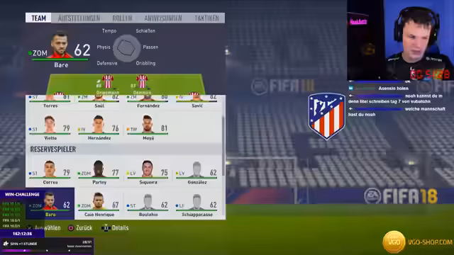 00:01:08Der Streamer beginnt den letzten Tag der Nostalgie-Karriere-Win-Challenge mit dem FIFA 18-Karrieremodus bei Atletico Madrid. Nach einem BVB Content Day und einem Gym-Besuch ist er motiviert, die Challenge zum Abschluss zu bringen. Die Führung bei Atletico Madrid wird analysiert und der Kader kritisch betrachtet. Stürmer wie Griezmann, Torres, Correa und Vito sowie Torhüter Oblak stehen im Fokus, die defensive Linie mit Filipe Luis, Juanfran, Hernandez und Saul wird als solide, aber alt eingestuft.