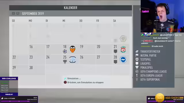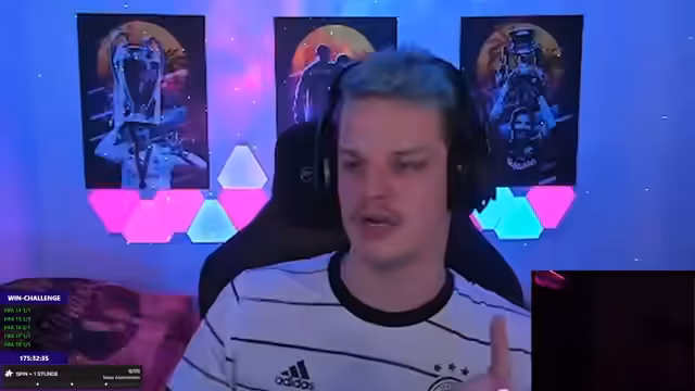 17:43:21Der Streamer startet in seine FIFA Weekend League und präsentiert ein Glücksrad mit extremen Challenges. Pro verlorenem Spiel muss er Aufgaben wie das ganze Aus einer Tabasco-Flasche trinken, mehrere Liegestütze machen oder einen ganzen Hotchip essen. Das Rad beinhaltet auch Belohnungen wie Tabasco-Exzesse und andere unkonventionelle Aufgaben, die den Streamer in körperliche und psychische Nöte bringen. Die Spannung steigt bei jedem Spielverlust, da die Belohnungen immer skurriler werden.
