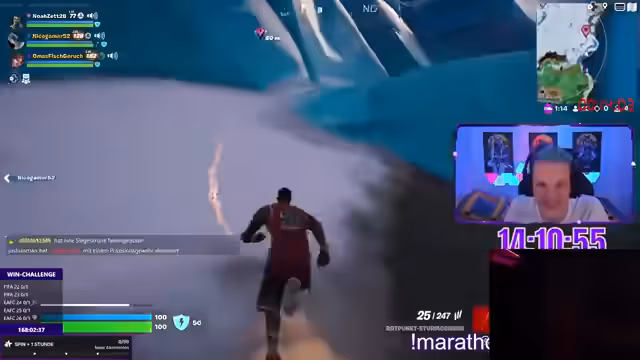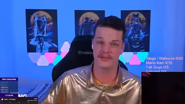 08:46:46Der Streamer startete in eine Nostalgie-Karriere-Win-Challenge Marathon. Er spielte verschiedene Spiele wie Fortnite, Warzone, Rainbow Six Siege, Mario Kart und Valorant. Jedes Spiel hatte spezifische Herausforderungen, wie z.B. 7 Kills in Fortnite oder ein Back-to-Back-Win in Mario Kart. Der Streamer versuchte, diese Herausforderungen zu meistern, aber es kam auch zu Rückschlägen, wie z.B. einem Minuswin. Es wurden verschiedene Preise wie Insta-Likes, Subs und Spenden vergeben, um die Motivation zu steigern.