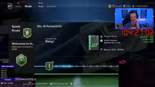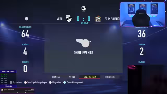 09:00:44Der Streamer begann mit der Weekend-League, bei der er mit einem 100-Mio.-Team 20 Spiele am Stück absolvierte. Das Team bestand aus Stars, Leihspielern und einigen Spielern, die nur 10 Spiele spielen sollten. Der Streamer äußerte sich besorgt über die sinkende Qualität der Gegner und die Möglichkeit, dass einige Gegner quitten könnten. Das erste Spiel wurde mit einem Sieg beendet, aber der Streamer betonte, dass es nur der Anfang sei und die kommenden Spiele noch schwieriger werden würden.