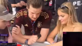 14:54:06Auf der Gamescom interagiert der Streamer intensiv mit den Besuchern, macht Fotos, lässt Unterschriften sammeln und teilt sich Getränke. Es kommt zu ausgelassenen Momenten, darunter Trinkspiele und der Konsum von Freibier. Der Streamer präsentiert sein Outfit, das er günstig auf einem türkischen Markt erworben hat, und interagiert humorvoll mit der Crowd, wobei die Stimmung ausgelassen und entspannt ist.