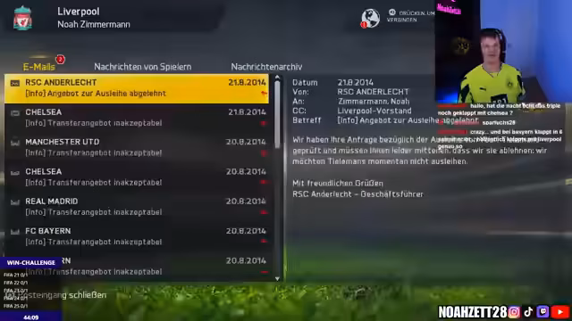 00:29:36Julian Brand soll ausgeliehen werden, da er ein zukunftsbasierter Spieler ist. PSV dreht durch und Memphis muss verpflichtet werden. Dani Alves will nicht kommen, also wird Zapaleta verpflichtet. Dani Alves kommt für die Erfahrung. Memphis Depay kommt, aber das Budget reicht nicht. Das Geld wird für den Winter benutzt. Memphis Depay ist brutal und Dani Alves war ein wichtiger Transfer-Kurzverschluss. Es fehlt noch ein Innenverteidiger. Es wird versucht, den Kader nach Rating zu sortieren. Memphis wird mitgenommen und auf Markovic gesetzt, damit er besser wird. Es wird eine gute Truppe zusammengestellt. Es wird versucht, Spieler auszusortieren, aber keiner will weggehen. Higuain wechselt für 40 Millionen zu City. Der Kader ist zu voll. Es wird überlegt, ob die erste Saison direkt ein Triple mit Real Madrid geholt wird. Es wird eine gute Elf zusammengestellt. Es wird überlegt, ob Gerard zu alt ist und Lever nach unten geht. Es wird über die Nostalgie von Chelsea gesprochen.