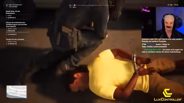 05:59:16Die Situation im Polizeisimulator eskaliert, als eine Person versucht, vor den Beamten zu fliehen, nachdem sie Müll weggeworfen hat. Der Streamer und Noah nehmen die Verfolgung auf und können die Person festnehmen. Dabei kommen Handschellen zum Einsatz, und ein Gefangenentransporter wird gerufen. Diese Aktion bringt den Spielern viele Punkte ein. Nach 90 Minuten endet die erste Schicht, und die Spieler erhalten eine Übersicht über ihre Leistungen, inklusive Level-Aufstieg und der Freischaltung eines Streifenwagens. Es wird eine zweite Schicht gestartet, um weitere Punkte zu sammeln. Hierbei werden erneut Strafzettel verteilt und verdächtige Personen kontrolliert. Eine Person wird wegen des Verdachts auf Drogenbesitz durchsucht und festgenommen, nachdem sie eine Waffe ohne gültigen Waffenschein bei sich hatte. Die Schicht endet abrupt, als die Spieler versuchen, eine Person festzunehmen, die nahe der Stadtgrenze flieht, was zu einem Verlust aller gesammelten Punkte führt. Das Fazit ist, dass die dunklen Ecken der Stadt genauer untersucht werden müssen.