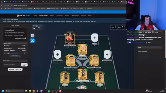 04:42:40Der Streamer testet verschiedene taktische Formationen und bewertet deren Eignung für seinen Spielstil. Er zeigt eine 3-5-2-Formation mit Sechsern und Innenverteidigern und testet, wie sie im Praxis funktioniert. Gleichzeitig diskutiert er die Besetzung der Positionen und welche Spieler am besten in seine Taktik passen würden.