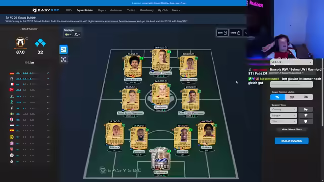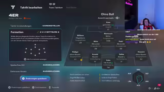 07:49:47Es wird über die Höhe der Abwehrkette diskutiert, um die Verteidiger weiter vorne zu positionieren und die Gegner ins Abseits zu locken. Verschiedene Formationen, darunter 4-4-2-2, werden in Betracht gezogen, um eine zweite Anspielstation zu Kane zu schaffen. Die 70er-Höhe wird als vielversprechend getestet. Es wird festgestellt, dass die aktuelle Formation irgendwie Meta ist, aber noch Feinschliff benötigt. Es wird überlegt, ob ein Waschbär im Team fehlt. Nach einer schlechten ersten Hälfte wird versucht, das Spiel durch taktische Anpassungen und den Einsatz von Marmoush zu drehen. Es kommt zu Frustration aufgrund des Spielverlaufs, und es wird überlegt, Mammusch durch Würz im Sturm zu ersetzen. Es wird festgestellt, dass Harry Kane trotz seiner Stärken nicht immer die Erwartungen erfüllt. Es wird eine defensive Taktik angewendet, um das Spiel herunterzuspielen. Es wird über die verrückte Qualifikation diskutiert und die Frage aufgeworfen, ob man die tausend Punkte zum Daddeln benötigt. Konan T wird trotz seiner Stärken kritisiert, und es wird eine neue Taktik gesucht. Die 4-1-4-1 Formation wird in Betracht gezogen, und es wird festgestellt, dass die beste Formation die mit zwei Sechsern und zwei Stürmern ist.