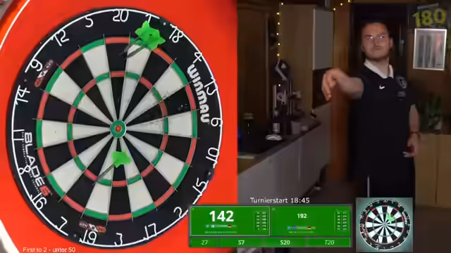 01:14:15Im zweiten Turnier trifft der Streamer auf einen Gegner namens Stonelli. Vor dem Match startet er eine Umfrage im Chat, in der die Mehrheit (85%) davon ausgeht, dass er in der ersten Runde ausscheiden wird. Trotzdem beginnt das Match motiviert und der Gegner zeigt sich stark. Der Streamer kämpft mit seinem Fokus, der durch Blick auf den Chat und Bildschirm abgelenkt wird, und versucht, seine Wurftechnik anzupassen, indem er auf die größeren Felder zielt anstatt nur auf die kleinen Triple-Felder.