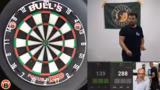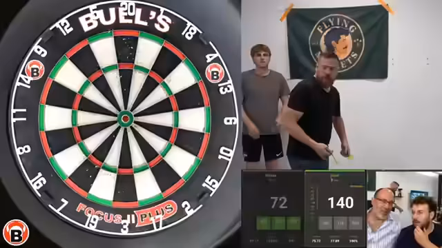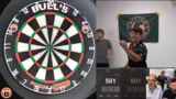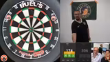 01:23:25Als nächstes steht das Duell zwischen den Content Creators Sola und Benji auf dem Programm. Sola, ehemaliger Challenger in League of Legends, trifft auf Benji, die 'Timetime-Legende'. Beide haben unterschiedliche Stile: Sola hat einen sehr geraden, sauberen Wurf, während Benji viel testet und noch nach seinem perfekten Setup sucht. Das Match ist auf Augenhöhe und endet in einen Decider. Sola hat dabei mehrere Chancen zum Finish, hat aber mit Nervenproblemen zu kämpfen. Trotzdem gelingt es ihm, mit einem perfekten Wurf auf Doppel 8 den Sieg zu holen.