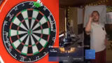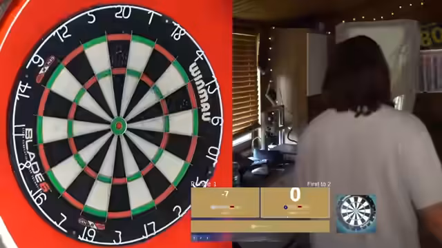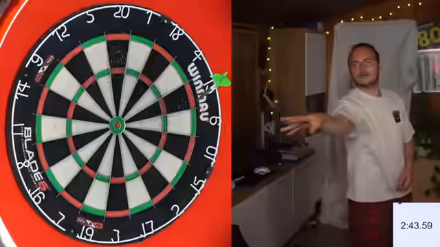 01:50:32Während der angekündigten Pause nutzt der Streamer die Zeit, um verschiedene Dart-Übungen zu probieren. Dazu gehört das gezielte Werfen gegen einen anderen Pfeil auf dem Board, um die Präzision zu verbessern. Er gibt jedoch offen zu, dass dies extrem schwierig für ihn ist und seine Würfe oft daneben gehen, was seinen Frust weiter befeuert, da er keine schnelle Lösung für seine Probleme findet.