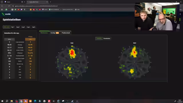 01:32:01Das erste Halbfinalspiel zwischen Basti und Anthony steht bevor, wobei Basti ein hartes Bracket zugelost bekommen hat. Es wird ein Topspiel erwartet. Anthony verliert das Ausbullen, was Basti den ersten Win sichert. Karl wird fälschlicherweise als Spanier bezeichnet, ist aber Deutscher kasachischer Abstammung. Das Topspiel zwischen Anthony und Basti beginnt mit viel Anfeuerung im Chat. Basti hatte im ersten Spiel einen 70er-Average, während Anthony leicht gestruggelt hat. Anthony findet das erste Triple, und es wird diskutiert, ob man sich über eine 140 freuen sollte oder nicht. Anthony spielt präzise und geht auf Bull, was als der einzig richtige Weg gegen Basti angesehen wird. Basti braucht den Druck, den Anthony ausübt. Es wird über ungewöhnliche Checkout-Versuche und die Bedeutung der Linie beim Spiel gesprochen. Das Rumgehäule als Taktik wird thematisiert. Die Flying Mullins Premier League Spieltage werden auch auf Benjis Kanal restreamt. Basti zeigt eine gute Trefferquote auf die Triple und lässt sich auch von niedrigen Würfen nicht beeindrucken, was auf seine Bundesliga-Erfahrung zurückzuführen ist.