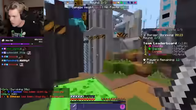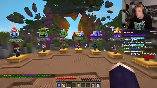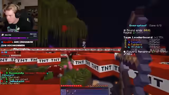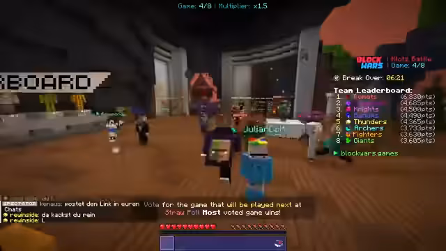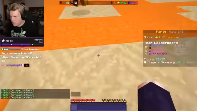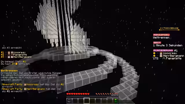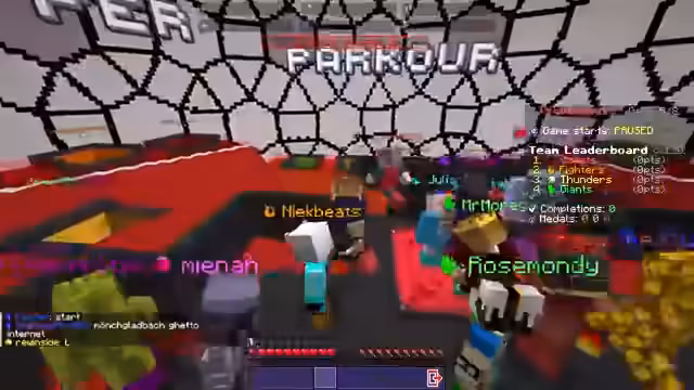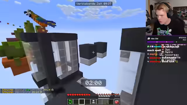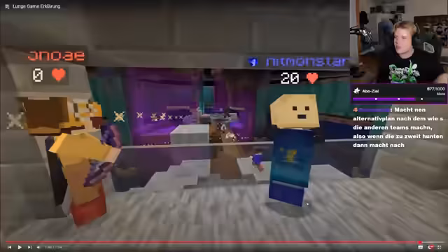01:38:09Die Spieler befinden sich in einem Jump'n'Run-Parcours und haben Schwierigkeiten mit bestimmten Abschnitten. Es wird die Bedeutung von Ruhe und Konzentration betont, um erfolgreich zu sein. Es wird angekündigt, dass das Team an einem 10.000 Euro Minecraft-Turnier teilnimmt. Die Regeln des Spielmodus werden weiter erklärt, insbesondere wie man Zeit gewinnt und im Shop ausgibt. Es wird überlegt, welche Items man für das Deathmatch kaufen soll. Die Spieler verlieren Zeit und werden von anderen Spielern angegriffen. Es wird festgestellt, dass die besten Spieler des Servers in der Lobby sind. Es wird überlegt, wie viel Zeit man im Endgame noch haben sollte. Es wird erwähnt, dass es bei den Jump'n'Run-Sachen verschiedene Schwierigkeitsgrade gibt, die unterschiedlich viele Punkte bringen. Es wird diskutiert, wie man die Schwierigkeitsgrade auf die Teammitglieder aufteilen soll, um eine optimale Punkteausbeute zu erzielen.