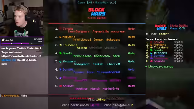 03:06:59Es gibt technische Probleme mit den Minecraft-Settings, die neu eingestellt werden müssen. Die Teameinteilung wird bekannt gegeben: Team Rot. Es wird über die Performance des PCs und die Mauseinstellungen diskutiert, die sich verzögert anfühlen. Es wird über die Wichtigkeit von Konzentration und die Ablenkungen durch andere gesprochen. Es wird über die Vorbereitung auf das Turnier gesprochen und dass man sich die Modi angeguckt hat und Taktiken von anderen Ländern sich angeguckt hat. Es wird überlegt, ob man Fulbright anmachen soll. Es wird überlegt, wie man alle in einen Channel bekommt. Es wird erwähnt, dass das Turnier in 18 Minuten losgeht und einige Teilnehmer noch nicht auf dem Server sind. Es wird überlegt, ob man noch eine kurze Ansprache machen soll. Es wird erwähnt, dass man Angst hat, zu enttäuschen.
