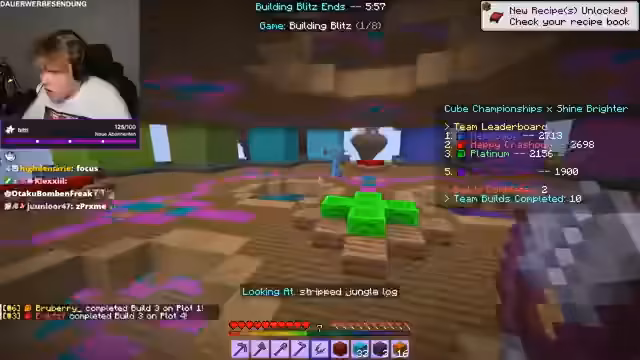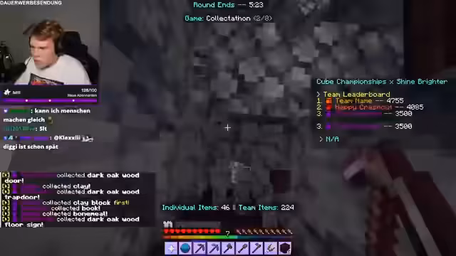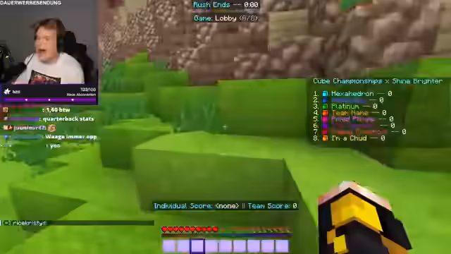 01:00:10Das erste Spieltyp ist 'Collectathon', bei dem Blöcke nach einer Vorlage eingesammelt und anschließend nachgebaut werden müssen. Das Team beginnt unkoordiniert; Platin und Hui drücken sofort, während der Streamer sich nach außen begibt. Die Kommunikation ist anfangs holprig und die Orientierung auf der Karte schwierig. Das Team landet nur auf dem sechsten Platz von acht Teams. Der Streamer fühlt sich als 'Bottom-Frag' und gibt an, die Anforderungen des Spiels falsch eingeschätzt zu haben, was die schwache Leistung begründet.
