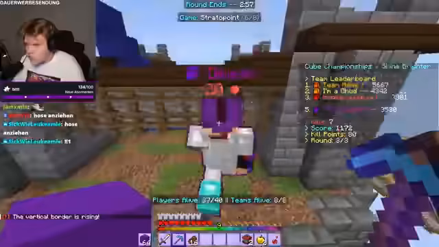 02:30:10Die Teilnehmer starten in den Modus 'Hunting Haven', der Skywars-ähnliche Züge hat. Das Ziel ist, Punkte durch das Einnehmen von Grenzgebieten ('Border') und durch Kills zu sammeln. Es wird eine Taktik entwickelt, um als Team gemeinsam vorzudringen, Ressourcen wie Eisenrüstung zu sammeln und in den Kampf zu ziehen. Der Streamer betont die Wichtigkeit von aggressivem Spielstil und Teamzusammenhalt, um Punkte zu sammeln.