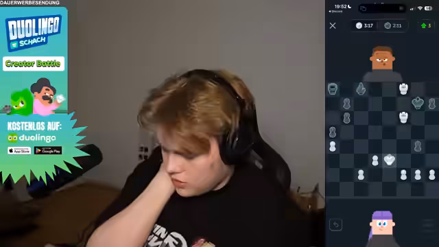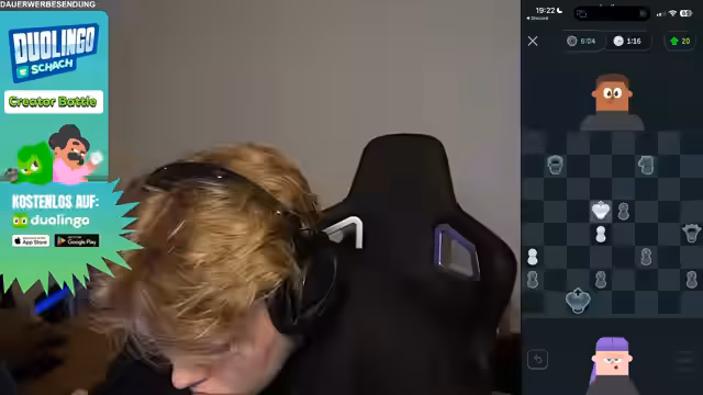 00:42:02Um seine Schwächen zu überwinden, wendet sich der Streamer der Schach-Funktion in der Duolingo-App zu. Er demonstriert, wie man Schritt für Schritt das Spiel lernen kann, und spielt erfolgreich gegen Bots, was ihm eine kleinen Stolz bereitet. Kurz darauf startet sein lang erwartetes Match gegen Elias Nerlich in einem Discord-Channel. Es ist ein "Best of 3"-Duell mit einem Joker pro Spieler. Die Partien sind geprägt von Nervosität, Fehlern und gegenseitigen Anklagen, der Gegner solle mit Hilfe des Chats (Rage Raid) spielen, obwohl beide Anfänger sind. Das Match endet unentschieden.
