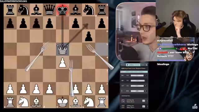 01:34:10In der Anfangsphase des Streams wird der Streamer des Betrugs bezichtigt. Der Vorwurf lautet, er lese den Chat seines Gegners und führe seine Züge entsprechend der Anweisungen aus, die dieser Mod im Chat postet. Der Streamer weist die Vorwürfe vehement zurück und betont, nur auf sein eigenes Spiel zu konzentrieren. Er bestätigt zwar, den Chat geöffnet zu haben, um auf mögliche Betrügereien zu prüfen, was aber zu einem hitzigen Disput mit den Zuschauern führt. Anschließend geht er ins Detail und diskutiert eine einzelne Zugsequenz in einem Schachspiel, wobei er offenbar ein spezifisches Manöver, das als 'Schäfer-Matt' bezeichnet wird, anwendet und dabei die Schachregeln für seine Gegenseite aufklärt.
