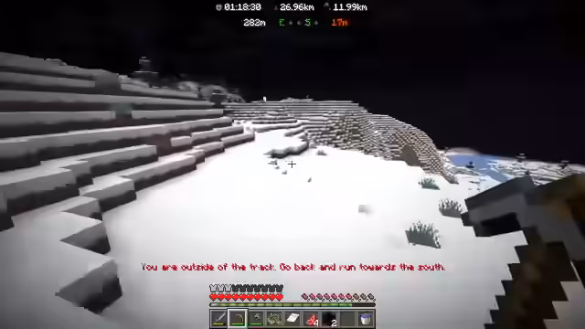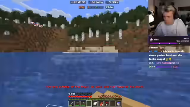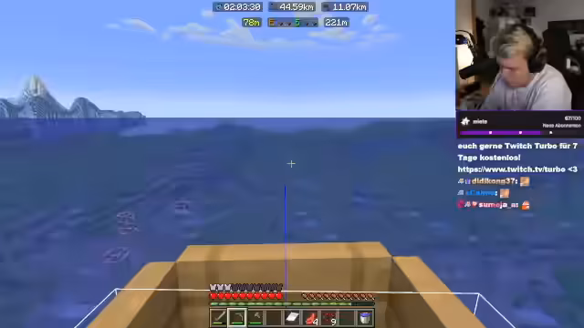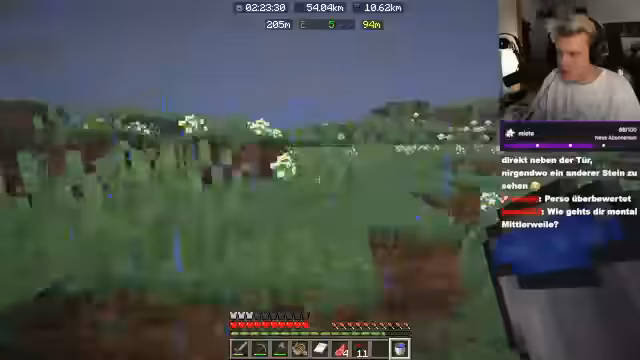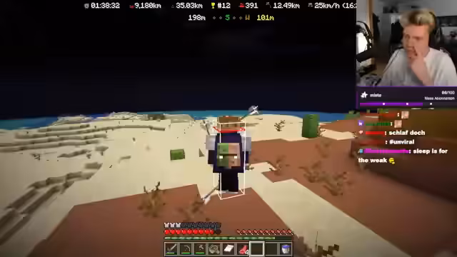 03:14:05Der Hauptteil des Streams ist ein Minecraft-Wettrennen, bei dem die Teilnehmer möglichst weit laufen, bevor die Border sie einholt. Der Streamer ist mit einem Pferd namens "Torpedo" unterwegs und berichtet von den Herausforderungen, wie unterschiedlichen Landschaften (Alpen, Ozean) und der ständigen Verfolgung durch die Border. Die Aufregung steigt, als die verbleibende Distanz zur Border rapide abnimmt und er mit Skeletten kämpfen muss, während er gleichzeitig die Platzierung verfolgt.