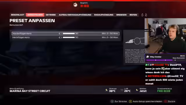 01:43:29Während eines Rennens auf dem Monaco-Kurs, unterbricht der Streamer das Gaming kurz, um seine neue Kleidung, ein neues Hemd und eine Jeans, dem Publikum vorzustellen und um deren Meinung zur Frische der Outfits zu fragen. Simultan treiben ihn technische Probleme wie Schäden am Fahrzeug und Verwirrung im Menü zur Einstellung des Rückspiegs zur Verzweiflung, was seine Konzentration beeinträchtigt und zu Fehlern im Rennen führt. Er unterhält das Publikum mit seinen spontanen Reaktionen und persönlichen Aussagen.
