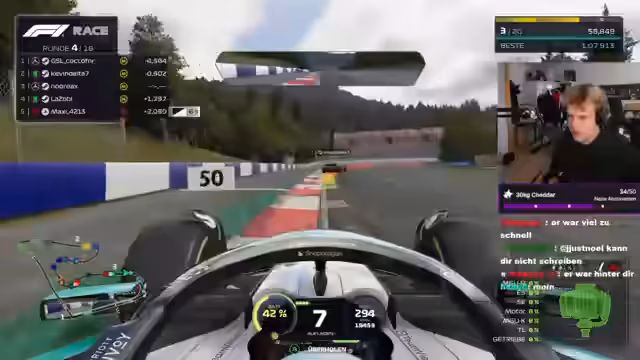 01:50:39Der Streamer reflektiert über seine Performance im Spiel und stellt fest, dass die Reduzierung des Lenkwinkels zwar anstrengender sei, aber zu mehr Präzision führen könnte. Er ist sich unsicher, ob dies die beste Strategie ist, da er sehr präzise fahren möchte. Er diskutiert den Kauf eines neuen Lenkrads, da sein aktuelles Gerät durch Verschütten von Flüssigkeit beschädigt wurde, und denkt über die Anschaffung eines professionellen Race Setups nach, was sein Engagement für das F1-Simulations-Racing unterstreicht.