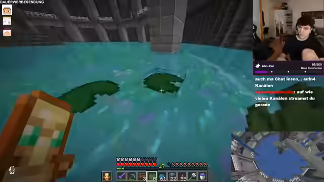 17:02:04Die Unterhaltung wechselt zu einem praktischen Minecraft-Segment. Der Streamer ist bemüht, dem Mitspieler Stegi zu helfen, indem er dessen im Tod verlorene Items in ihrer gemeinsamen Base sammelt. Er präsentiert ihm wertvolle Gegenstände wie goldene Karotten und verzauberte Werkzeuge. Danach widmet er sich seinen eigenen Bauprojekten, zeigt einen Basti-Tunnel und Übergänge zwischen Basen und beschreibt sein Vorhaben, ein abgeranztes, zugewachsenes Kanalsystem zu gestalten, was seine Kreativität und das langfristige Bauen im Server zeigt.