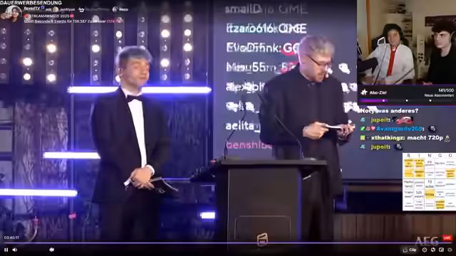 12:16:45In der Kategorie 'Follower-Zuwachs' ging der Preis in der weiblichen Kategorie an eine Streamerin, die im Jahr 2025 über 105.000 neue Follower auf Twitch gewinnen konnte. Die Preisträgerin bedankte sich bei ihrer Community und allen, die ihr eine Bühne gegeben haben. Die männliche Kategorie ging an Zabex.
