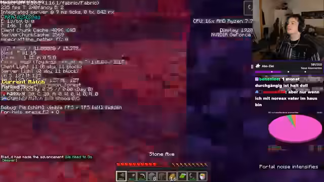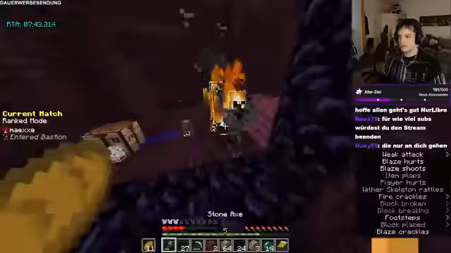 03:45:56Im Stream geht es hauptsächlich um das Spiel Minecraft. Der Streamer beschreibt das aktuelle Ziel: Gold aus den Wänden zu looten, um mit Piglins zu handeln und Enderperlen zu erhalten. Diese werden für das Herstellen von Portale benötigt. Der Plan ist anschließend zur Festung zu reisen, um Blazes zu töten und Netherstern zu farmen. Es wird auch die Lust am Spiel und die schnelle Lernkurve für solche Strategien betont.