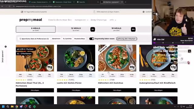 04:39:00Der Streamer bedankt sich ausdrücklich bei PrepMyMeal als Sponsor, der das Projekt durch lieferbare Mahlzeiten mitgetragen habe, da niemand im Team kochen könne. Er empfiehlt den Service wärmstens mit Hinweis auf vegan-, glutenfrei- und muskelaufbauoptimierte Optionen und erwähnt den Rabattcode 'NOREAX'. Shoutouts folgen an das Nachtschicht-Team Veto, Dima, Blood und Prime, an Murat für organisatorische Unterstützung und an seinen Vater, der es ermöglichte, dass fünf fremde Männer zwei Monate in seinem Haus wohnen durften.
