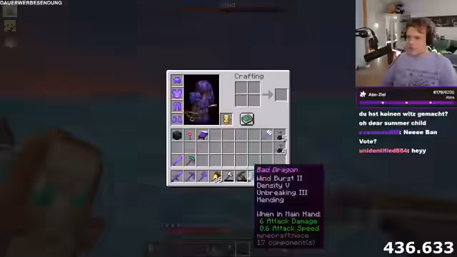 06:22:53Ein geplantes Mini-Musical-Event um 18 Uhr mit Hugo wird angekündigt und als "krass" und "tough" beschrieben. Der Streamer bittet die Chatmitglieder, bei dem Event mitzumachen und die Darsteller positiv zu bestätigen. Als Bezahlung für die Teilnahme am Event wird ein "random item" in Betracht gezogen, wobei der Streamer bereits Diamanten und ein Netherite-Upgrade-Template als mögliche Gaben ins Auge fasst.