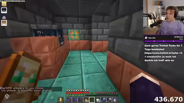 02:44:42Neue Ankündigungen für den Server werden besprochen. Raketen werden für die Enderöffnung eingeschränkt, wofür die Happy-Ghasts schneller hergestellt werden. Ein neues Feature soll einen Diamanten-Highscore im Einkaufsdistrikt anzeigen und ermöglichen, Diamanten auf ein Konto einzuzahlen. Der Streamer zeigt großes Interesse an dieser Diamanten-Farm-Wettbewerb, da er reich werden will.