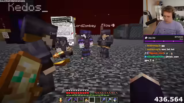 01:03:44Ein Streit entsteht zwischen Paul und Noriax über dessen Rolle in der Minecraft-Gemeinschaft. Paul wirft Noriax vor, etwas Geheimes zu verbergen, und Noriax warnt ihn vorsichtig, nicht weiter darüber zu reden. Gleichzeitig planen Noriax und Niki einen Streich, bei sie Villager in einer Basis versammeln und mit Eiern bombardieren wollen, um sie in einen geschlossenen Raum zu locken und zu überfallen, was als "Kinder-Prank" bezeichnet wird.
