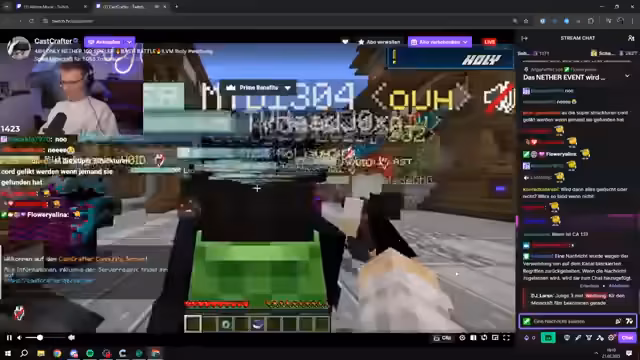 01:39:03Der Streamer plant einen 48-Stunden-Only-Nether-Event mit Heiko, bei dem 100 Spieler teilnehmen. Er beschreibt das Ziel des Events und dass es einen Boss am Ende gibt. Allerdings treten technische Probleme auf, sowohl bei seiner Kamera als auch bei der Übertragung. Er äußert seine Frustration über die laufenden Konfigurationsprobleme und dass die Config für den Event verloren geht.